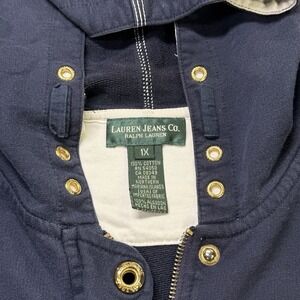 Classic Lauren Jeans Co. (Ralph Lauren) women's hooded jacket in a deep navy cotton with signature RL67 arm patch, gold-tone grommet snaps, and full zip front. Heavier midweight fabric with contrast stitching gives it a rugged, heritage-inspired feel — perfect for casual layering or vintage-style streetwear.