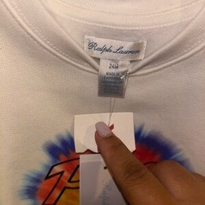 Vibrant Ralph Lauren sweatshirt with a colorful logo design. Features splashes of blue and orange on a cream background. Ideal for a playful look.