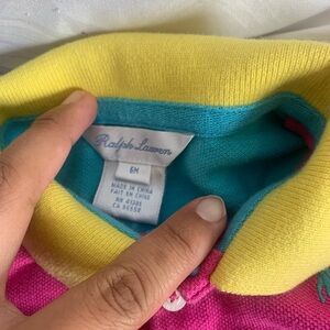 Vibrant polo dress with ruffled hem. Features pink, yellow, green, and orange accents. Perfect for playful days.
