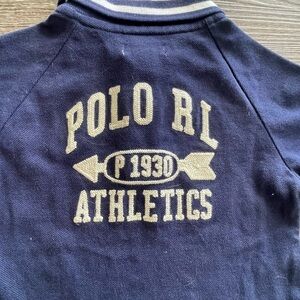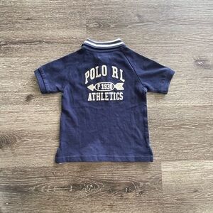 Classic polo with navy sleeves and gray body. Red logo accent. Ideal for casual wear.