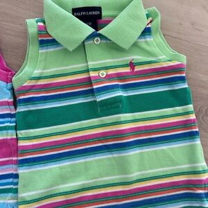 Brighten up your child's wardrobe with these Ralph Lauren striped polo shirts. Featuring vibrant pink and green colors, these shirts offer both style and comfort for any occasion.