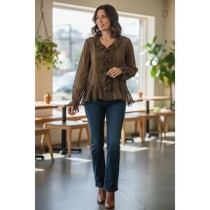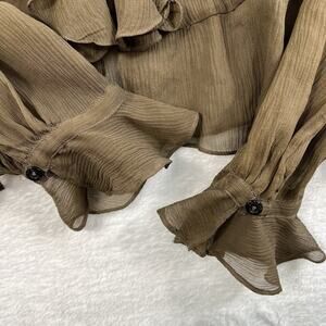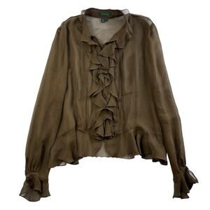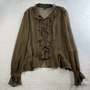 Ralph Lauren LRL L Large Silk Top Ruffle Front Long Sleeve Button Down Top Sheer