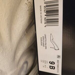 NIB/Original box/packaging. Both shoes and box are perfect. No rips/stains/scuffs/tears/peeling or wear. Color is Sand, to me more of a pale cream. Smoke free home. No odors. All offers are welcome. Thank you!