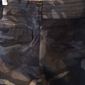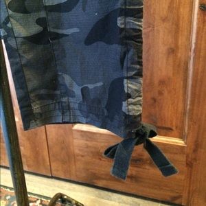 NWOT camouflaged in grey charcoal tones. Can pull vertical ribbon on side at hems or wear loose. Zip close with two snaps and button at waist. Inseam approx 27". Front rise approx 9" photos show pockets and hem options These are a sophisticated take on this camouflage design.