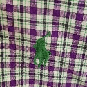 ralph lauren plaid shirt, hong kong button down, purple green gingham logo