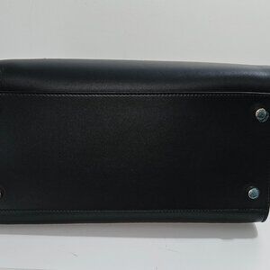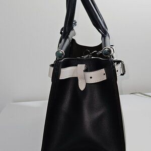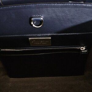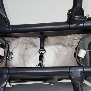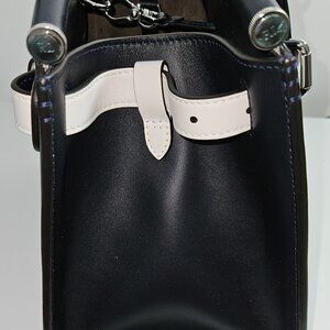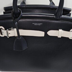 Beautiful and in pristine condition never used Ralph Lauren made in Italy supple leather tote/handbag. Rich deep navy blue with adjustable white trim. Handbag can be hand carried or worn as shoulder or crossbody with included strap. Silver tone hardware with key ring, feet protectors, inside closure, zippered interior pocket and strap rings. Approx size 11.5x9x6.5 in