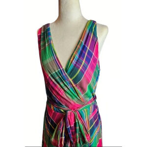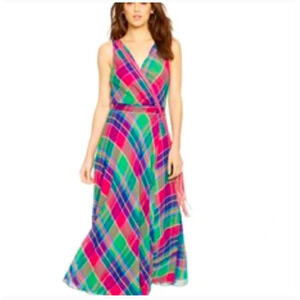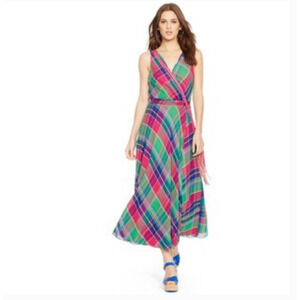 Ralph Lauren Madrid Wrap Maxi Dress. Pink, blue and green Madras plaid. Tie wrap waist. Contrast lined in pink. Excellent condition. Size 12.