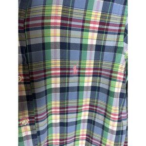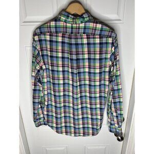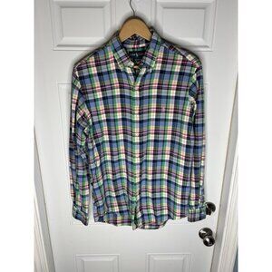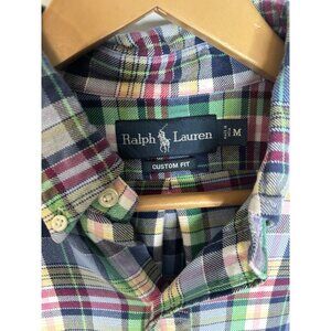 This product is a men's Ralph Lauren medium plaid long-sleeved button-down shirt. It features a classic button-down collar and is made by the brand Lauren Ralph Lauren. The shirt comes in a size M and is designed with a regular fit. The multicolor plaid pattern adds a stylish touch to this casual button-up shirt, making it a versatile and timeless addition to any man's wardrobe.