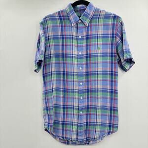 Ralph Lauren Men's 100% Linen Button Down Shirt Sz S Blue Plaid Short Sleeve