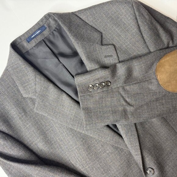 This Ralph Lauren Men’s Blazer in size 44R is a classic fit, 2-button sport coat made of a luxurious blend of cashmere and wool. The leather elbow patches and gray tweed fabric with a textured micro check pattern gives it a sophisticated and stylish look. Perfect for a wedding, party, casual occasion or business setting, this blazer features a notch lapel, four-button sleeve, inner pockets, and a single vented back. Made in Canada, this high-quality blazer exudes a timeless elegance and is sure to make a statement in any season. Measurements included in photos for your sizing and fit information. Very good pre-owned condition