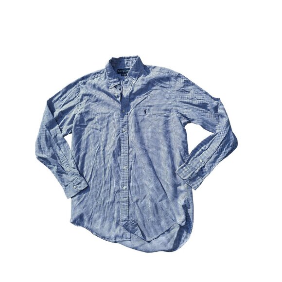 men's shirt, Ralph Lauren, blue checkered, button-down shirt, long sleeve, classic fit, preppy style, size 15.5, cotton shirt, designer logo, casual wear, embroidered logo, tailored fit, business casual