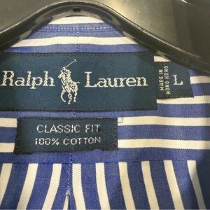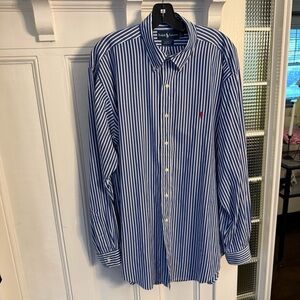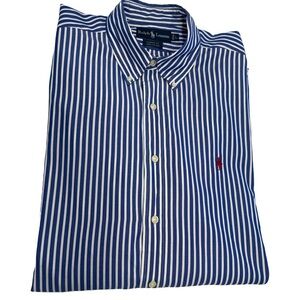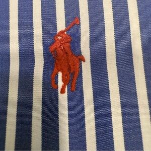 Excellent condition. Men’s Ralph Lauren blue and white striped button down shirt. Long sleeves, button down collar, red embroidered pony logo. Size large. See photos for measurements