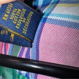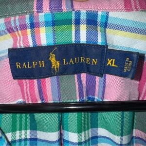 This product is a men's Ralph Lauren plaid long sleeve button down polo in size XL. Made of lightweight cotton in a multicolor plaid design, this shirt is suitable for various occasions such as weddings, parties, casual outings, formal events, workwear, and business meetings. The collared neckline and button closure add a touch of sophistication, making it a versatile piece for all seasons. Machine washable and featuring a regular fit, this Ralph Lauren shirt is a stylish and comfortable choice for any man's wardrobe.