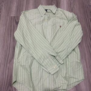 Elevate your wardrobe with the Ralph Lauren Men's Green Striped Shirt. This stylish shirt features a classic green color with white stripes, perfect for any occasion. Like new condition!