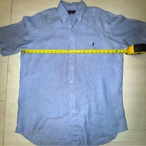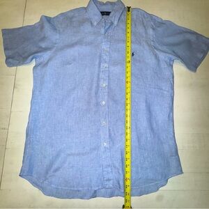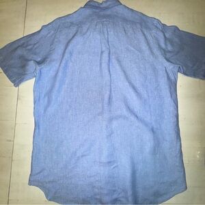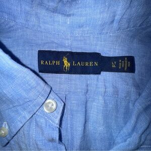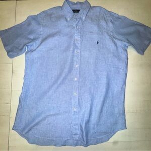 Stylish light blue button-down linen shirt by Ralph Lauren. Ideal for casual outings. Features classic design and comfortable fit.