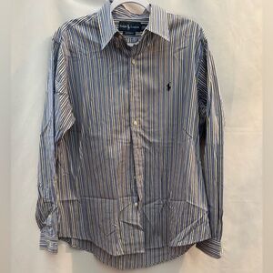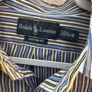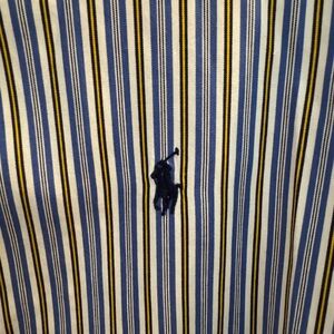 This Ralph Lauren Men’s Long Sleeve Button Down Shirt was worn a couple of times. It is blue, white, and yellow striped. It is a size large and in excellent condition. Very nice!