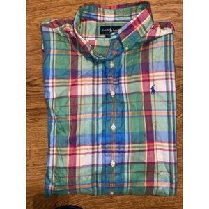 This Ralph Lauren men's shirt in size XXL features a colorful multi-colored plaid pattern, making it a stylish and vibrant addition to any wardrobe. With a classic button-up front and long sleeves, this shirt is perfect for casual occasions while still maintaining a polished and professional look. The iconic Ralph Lauren brand ensures high quality and timeless style that will keep you looking sharp in any setting.
