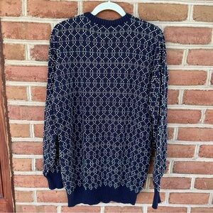 Elegant navy sweater with intricate white pattern. Ideal for casual wear.