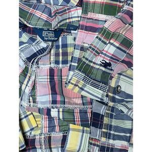 Made a 57% cotton and 43% nylon. Features a side pocket, Velcro fly and ties at the waist. Laying flat measures 19" in the waist, 23" in the hips, 11" rise, and 9" inseam. Be sure to check out all of my other Ralph Lauren listings.