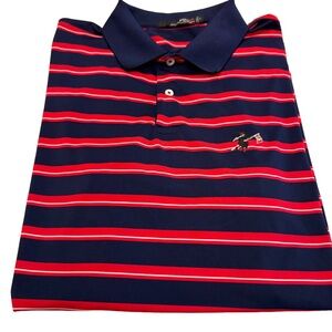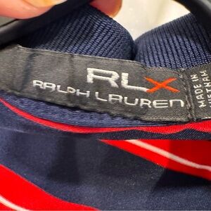 BRAND NEW Ralph Lauren Active RLX Men’s polo/ golf shirt. Short sleeves, red, navy blue & white stripes, moisture wicking, 18 hole embroidered witch logo, RLX logo on sleeve, stretch, 75% polyester 25% spandex. Size L. See photos for measurements MSRP $130