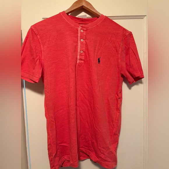 Classic red Henley by Ralph Lauren. Short sleeves and buttoned front. Perfect for casual wear.