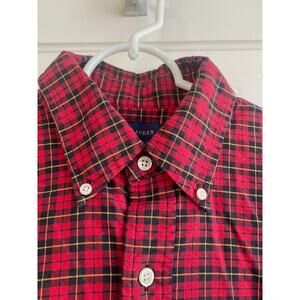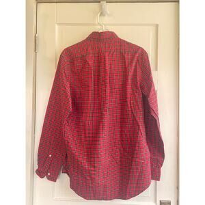 Ralph Lauren button down, long sleeve shirt in size medium. It is 100% cotton fabric in a red and black plaid.