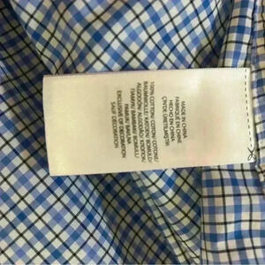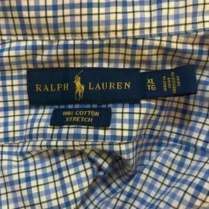 Ralph Lauren Men’s Stretch Button Up Blue Gingham Dress Shirt. XL. Chest 50”, Sleeve length 27”, Shoulder width 20”. Preowned .