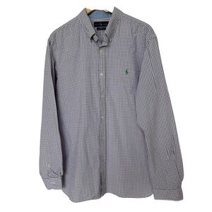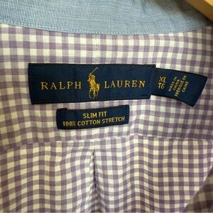 Keywords: Ralph Lauren, button-up, purple check, slim fit, long sleeve, men's casual shirt, spring fashion, collared shirt, machine washable, pre-owned.