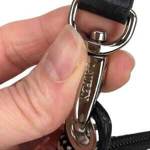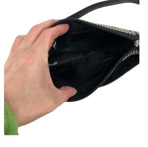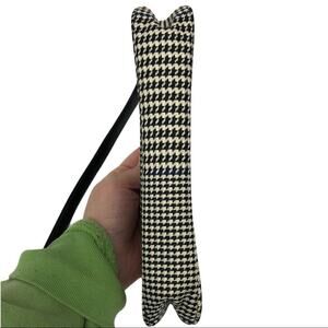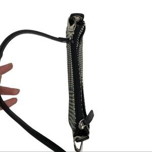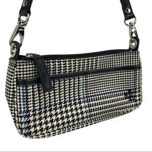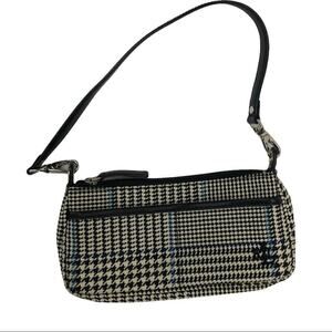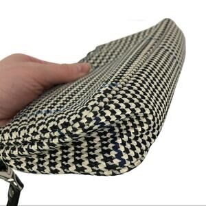 LAUREN RALPH LAUREN Houndstooth Canvas Pochette, Black and white houndstooth woven canvas Lauren Ralph Lauren pochette with silver-tone hardware, black leather trim, single flat shoulder strap, dual exterior slit pockets at front, black embroidered logo accent, black woven lining, single zip pocket at interior wall and zip closure at top. 1º photo is just for reference