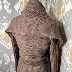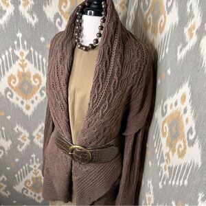 Crafted in a sumptuous cabled knit, creating easy elegance in a chic, draped silhouette. Tobacco cashmere blend, open front circle cardigan, crafted in a sumptuous Aran cableknit, creating easy elegance in a chic, draped silhouette.
