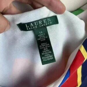 This listing features a Ralph Lauren women's multi skirt showcasing a vibrant multi-color geometric print. This stylish skirt is perfect for adding a pop of color to your wardrobe and can be dressed up or down for various occasions.