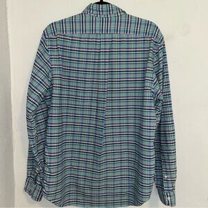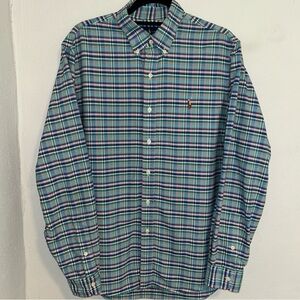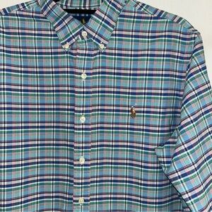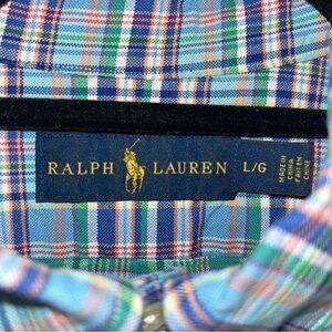 Vibrant plaid shirt with a mix of colors. Features Ralph Lauren branding.