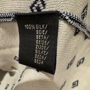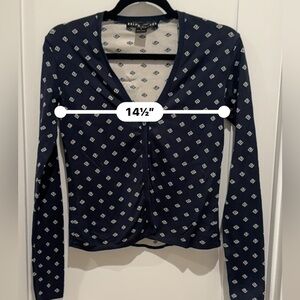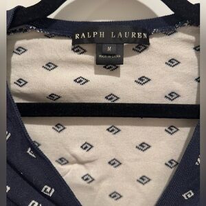 Stylish Ralph Lauren cardigan. Navy with white geometric pattern. Perfect for layering.