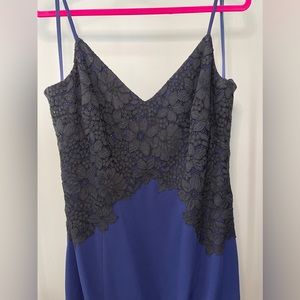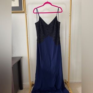 Navy gown with black lace detail. Worn once. Will ship with original garment bag