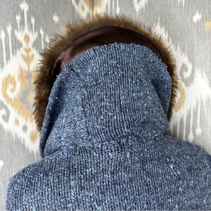 Incredibly versatile blue grey mélange tweed knit, shawl collar cardigan, with a luxe detachable sable brown Italian lamb shearling collar.