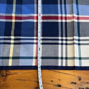 Elegant plaid handkerchief featuring navy, white, and red. Embroidered logo detail. NWT. I can’t read the writing so it is either 100% silk or cotton. Feels more like cotton material!