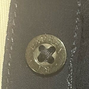 Elegant navy tee with ruffle detailing and logo buttons. Looks great and feels even better.