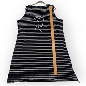 Stylish navy dress with white stripes. Features a lace-up neckline. Sleeveless design.