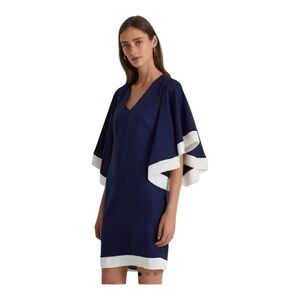 Brand new with tags! This Lauren Ralph Lauren dress is the perfect statement piece for work, dinner, or events. Featuring a stunning French Navy hue with crisp white trim, this sheath dress has elegant cape-style sleeves for a modern, sophisticated silhouette.