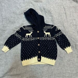 Cozy navy sweater with cream reindeer pattern. Button-up front. Hooded design. Perfect for chilly days.