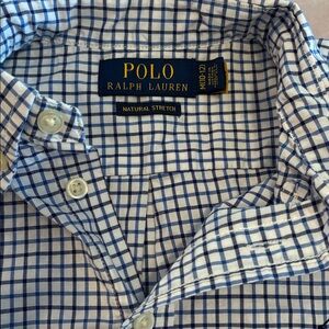Classic checkered shirt by Ralph Lauren. Features navy and white pattern. Button-down style.