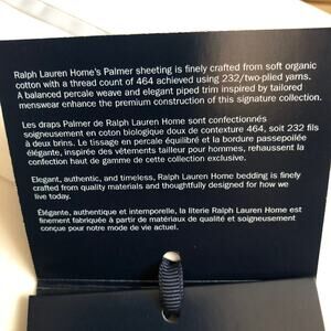 Ralph Lauren’s Palmer sheeting is finely crafted with organic cotton and has a luxurious thread count of 464, which is achieved using 232/two-plied yarns. Detailed with suiting-inspired piped trim, the breathable percale weave has a matte finish that resists pilling and produces an exceptionally cool, crisp hand that softens with every wash.