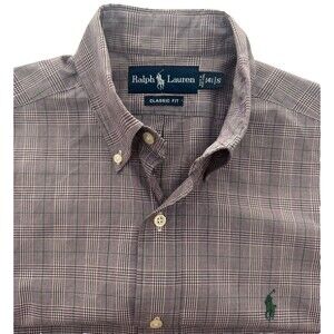 The Ralph Lauren Oxford Button Front Shirt for men in size small features a classic fit in a purplish green plaid pattern, making it suitable for various occasions such as parties, casual wear, and business environments. This collared shirt with a button-down style and long sleeves is made of cotton, making it suitable for all seasons. With its iconic preppy and classic theme, this Ralph Lauren shirt is a versatile and stylish addition to any man's wardrobe.