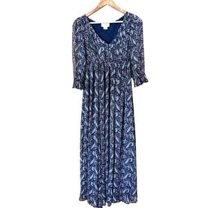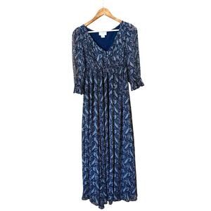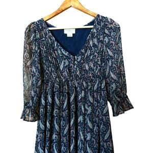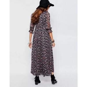 Beautiful boho vibes from Ralph Lauren’s Denim & Supply line. This paisley maxi dress in soft navy chiffon has romantic prairiecore energy with a breezy, lightweight feel. Features a v-neckline with button front, elastic empire waist, and sheer 3/4 sleeves with a delicate ruffle cuff.