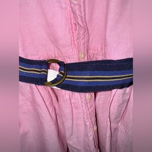Ralph Lauren Pink Fit Flair Belted Shirt Dress Girls Size 14 Long Sleeve white Peter Pan Collared. Chic pink dress with a classic collar. Features a stylish navy blue striped belt. Perfect for any occasion. There is a fabric snag on the back of the white collar. Front button down. Preowned smoke free 1 white dog home.