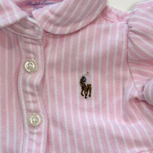 A charming Ralph Lauren baby dress featuring classic pink-and-white stripes, puff sleeves, and a full button-down front. Made from soft, breathable cotton for all-day comfort. Perfect for special occasions, family photos, or a polished everyday look.