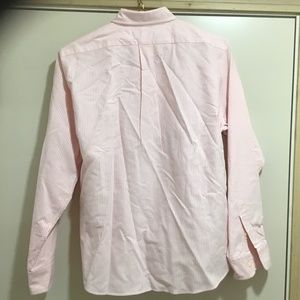 Classic button-down shirt. Pink stripes. Embroidered logo on chest.
