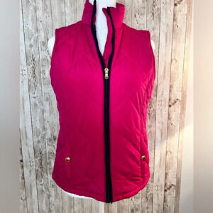 Color of 2023! This pink quilted vest is so pretty with navy lining and gold hardware. Perfect for a cool day. Size XS, lightly used condition.