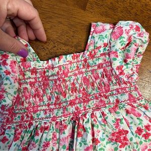 Charming baby dress with pink floral pattern. Features delicate smocking. Perfect for special occasions.