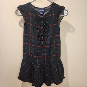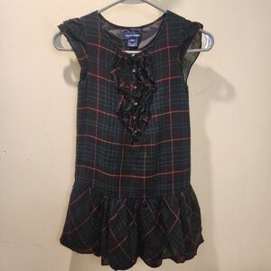 Charming Ralph Lauren plaid dress with ruffle details. Features a mix of black, red, and green colors.